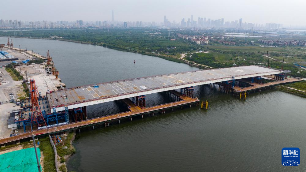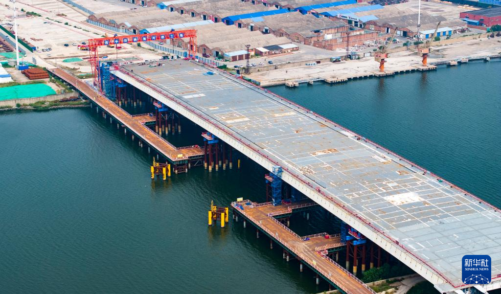 這是9月16日拍攝的天津市濱海新區西中環快速路跨海河橋工程建設現場(無人機照片)。新華社記者 趙子碩 攝