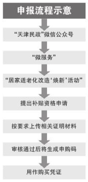 老年消費者及家庭可通過“天津民政”微信公眾號—“微服務”—“居家適老化改造‘煥新’活動”移動應用端提出補貼資格申請,并按要求上傳相關證明材料。居住地所在區民政部門原則上在5個工作日內,對申請人資格進行審核確認,申請材料審核通過后生成申購碼,用作購買憑證。