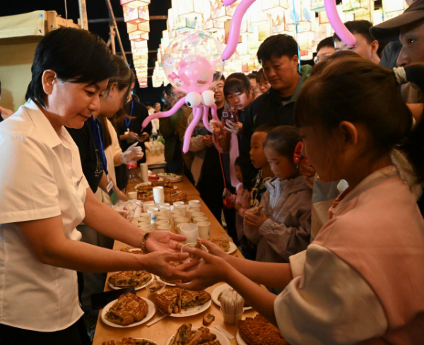 活動現場,溫情與雅韻交織。天津市非遺“劉氏元宵制作技藝”傳承人駐守展臺,剛出爐的月餅裹著熱氣,金黃餅皮上“中秋”“團圓”字樣格外醒目,現場共同分切6塊2斤重的大月餅,將中秋團圓的祝福傳遞給現場游客。