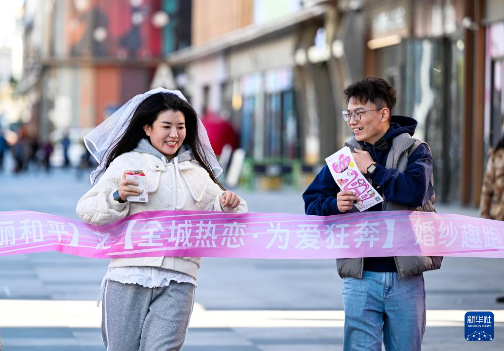 11月2日,參加活動的一對情侶在婚紗趣跑比賽中。新華社記者 趙子碩 攝pagebreak
